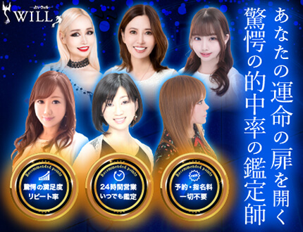 | 【ウィル】 当たると口コミで話題!1,0000円相当無料キャンペーン実施中 | 月間1万件超の鑑定実績 | 初回10分無料、 待たずに優先鑑定! | 渋谷に店舗があり、実際に鑑定師に会える! |